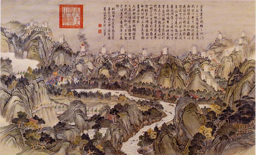 Keywords: Conquest of the mountain range at Yixi and Daertu.jpg en Conquest of the mountain range at Yixi and Daertu a scene of the Jinchuan Campaign 1771-1776 zh-hans 平定两金 战役之 攻克 达尔图山梁 http //www battle-of-qurman com cn/e/hist htm late XVIII century A collaboration between Chinese and European painters The Jesuit missionaries involved in producing the drawings in China were Giuseppe Castiglione Jean-Denis Attiret Ignace Sichelbart and Jean Damascene The engravings were executed in Paris under the direction of Charles-Nicolas Cochin of the Académie Royal at the Court of Louis XVI and the individual engravers include Le Bas Aliamet Prevot Saint-Aubin Masquelier Choffard and Launay PD-Art Military of Qing China Ten Great Campaigns Paintings of the Qing Dynasty |