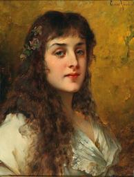 | Keywords: Conrad Kiesel Bildnis einer Dame mit Schneerosen im Haar.jpg Bildnis einer Dame mit Schneerosen im Haar signiert Conrad Kiesel pxt Öl auf Leinwand 46 x36 cm http //www dorotheum com/ before 1921 Creator Conrad Kiesel PD-old-auto-1923 1921 Images from Dorotheum Conrad Kiesel Portrait paintings of women with hair flowers |