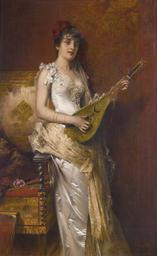 Keywords: Conrad Kiesel - Daydreams.jpg Artwork Creator Conrad Kiesel < 1921 Oil on Canvas Size cm 39 5 63 object history M Newman Ltd London<br /> Purchased from the above by the father of the present owner exhibition history credit line place of creation inscription Conrad Kiesel signature bottom right http //www sothebys com/en/auctions/ecatalogue/2013/european-paintings-l13101/lot 253 html Sothebys com http //www sothebys com/content/dam/stb/lots/L13/L13101/004L13101_6SG2Z jpg direct link accession number PD-old-auto-1923 1921 Paintings of women playing musical instruments indoors Daydreams in art Paintings of women with hair flowers Conrad Kiesel