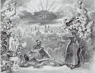 | Keywords: Conrad Werdmüller Gottfried Keller Pfiferjoggeli.jpg «Gottfried Keller überwindet den Pfiferjoggeli» Federzeichnung 25 x 32 5 cm Gottfried Keller überwindet den Pfiferjoggeli GK defeating a fellow student nicknamed Pfiferjoggeli pen and ink on paper 25 x 32 5 cm Zentralbibliothek Zürich 1840-42 Johann Conrad Werdmüller 1819-92 PD-old Gottfried Keller Johann Conrad Werdmüller | ||||