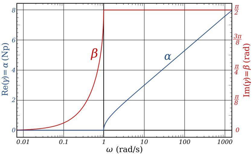 | Keywords: Constant-k Filter Transmission Parameters.svg transmission parameters <math>\gamma \alpha + i \beta</math> of a prototype low-pass constant-k filter of a single half-section <br> <math>\gamma \alpha + i \beta \begin cases 0 + \sin -1 \frac \omega \omega_c \omega < \omega_c \\ \cosh -1 \frac \omega \omega_c + i \frac \pi 2 \omega > \omega_c \end cases </math> α is measured in nepers and β in radians own Inductiveload 2009-11-23 Mathematica Code <pre><nowiki> l 1; c 1; wc 1/Sqrtl c; gamw_ Piecewise I ArcSinw/wc w < wc ArcCoshw/wc + I Pi/2 w \GreaterSlantEqual wc alphaw_ Regamw; betaw_ Imgamw; LogLinearPlot alphaw betaw w 0 01 10 3 PlotRange -> All PlotPoints -> 1000 </nowiki></pre> Transmission parameters Constant-k filters |