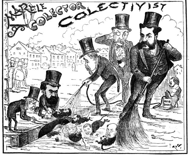 | Keywords: Constantin Jiquidi - Marele colector colectivist, Epoca Supliment Ilustrat, 16 ian 1889.png en Marele colector colectivist The Great Collectivist Gutter depicting political life in 1888 “1889 Romania The new Conservative administration using phenol a powerful disinfectant to clean out the streets of Bucharest infested by the outgoing National Liberal government The disinfecting team from left Lascăr Catargiu Nicolae Fleva unknown possibly Iacob Felix the physician Petre P Carp Gheorghe Gr Cantacuzino and in the background physician Victor BabeÈ™ The rats include Ion Brătianu and Mihail Kogălniceanu 1889-01-28 Epoca Supliment Ilustrat No 946 Creator Constantin Jiquidi other versions Custom license marker 2016 08 25 PD-old-auto 1899 Political cartoons by Constantin Jiquidi Epoca Romanian newspaper Caricatures of Ion Brătianu Caricatures of Gheorghe Grigore Cantacuzino Caricatures of Petre P Carp Caricatures of Lascăr Catargiu Caricatures of Nicolae Fleva Caricatures of Mihail Kogălniceanu Victor BabeÈ™ Iacob Felix 1889 in Bucharest 1899 cartoons 1890s political cartoons Medicine in the 1890s Phenol Disinfection street cleaning Gutters Besom brooms in art Rats in art |