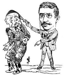 | Keywords: Constantin Jiquidi - Sache Petreanu, Foaia Populară, 14 feb 1899.JPG en Sache Petreanu the Romanian journalist and progressive Jewish activist One of the major contributors to the left-wing review Adevărul he is shown here trimming the payot of a traditionalist Jew - a reference to his advocacy of assimiliation into the Romanian mainstream A vocal critic of the Romanian governments at a time when mainstream Romanian politicians refused to enact the emancipation of Jews Petreanu had been expelled from Romania by the time this cartoon saw print 1899-02-14 Foaia Populară accessible through http //digitool dc bmms ro 8881/R RN 709438175 DacoRomanica Bucharest City Library Creator Constantin Jiquidi PD-old-100 Uploaded with UploadWizard Political cartoons by Constantin Jiquidi Caricatures of writers from Romania Journalists from Romania Jewish people of Romania Adevărul Payots 1899 cartoons 1890s political cartoons 1899 in Romania Fashion in 1899 |