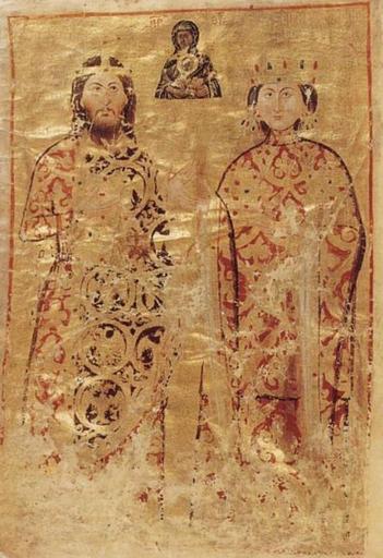 | Keywords: Constantine Palaiologos sebastokrator and Eirene.jpg sebastokrator Constantine Palaiologos and his wife Eirene from the Typikon of the Monastery of Our Lady of Certain Hope Lincoln Typicon Oxford Bodleian Library Lincoln College Ms Gr 35 Cplakidas 1328-1344 PD-old-100 Medieval miniatures of Byzantine emperors Palaiologos dynasty Portrait miniatures of Byzantine Empire Lincoln Typikon Ktitor Illuminated manuscripts in the United Kingdom Ornamental textiles in art Double-headed eagles Konstantinos Palaiologos Byzantine textiles |