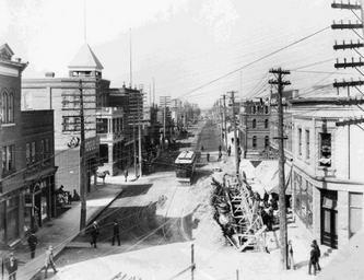 | Keywords: victoria avenue victoriaavenue fort william fortwilliam thunder bay thunderbay streetcars construction hotels telegraph telegraph poles telegraphpoles telegraph wires telegraphwires transportation st. louis hotel stlouishotel avenue hotel avenuehotel ontario canada history blackandwhite monochrome road outdoor snow building architecture black and white Date: Unknown Description: Shot from the roof of a nearby building, this photograph shows hundreds of telegraph wires criss-cross the street. A dry goods store, a drug store, and the Avenue Hotel line the left-hand side of Victoria Avenue, while Dr. Dean, a dentist, occupies an office on the top floor of the building in foreground at right. Construction on the street nearly blocks the entrance to The Star, a men's clothing, footwear, and furnishings store. The St. Louis Hotel's marquee can just be made out on the right (middleground). Accession No.: 981.39.204 Date: Unknown Description: Shot from the roof of a nearby building, this photograph shows hundreds of telegraph wires criss-cross the street. A dry goods store, a drug store, and the Avenue Hotel line the left-hand side of Victoria Avenue, while Dr. Dean, a dentist, occupies an office on the top floor of the building in foreground at right. Construction on the street nearly blocks the entrance to The Star, a men's clothing, footwear, and furnishings store. The St. Louis Hotel's marquee can just be made out on the right (middleground). Accession No.: 981.39.204 |