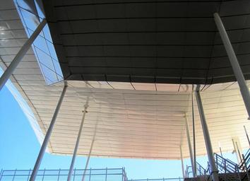 Keywords: construction roof overhead poles upright metal white lines angles railings blue sky