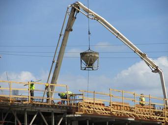 Keywords: construction site cement crane pump laborers building architecture workers development progress commercial people contractor bucket hose snorkel foreman helmet project build builder job
