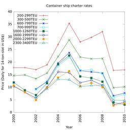 | Keywords: Container-ship-rates.svg en Container ship charter rates 2000-2010 in U S dollars per 14-ton-slot per day Data from page 86 of cite book United Nations Conference on Trade and Development UNCTAD United Nations Conference on Trade and Development Review of Maritime Transport 2010 http //www unctad org/Templates/Download asp docid 14218 lang 1 intItemID 2068 2010 United Nations New York and Geneva PDF 978-92-1-112810-9 ; Gnuplot data file <pre> From RMT 2010 p 86 2000 17 8 14 6 11 9 10 4 10 7 2001 17 8 14 9 8 8 8 0 8 0 2002 17 0 13 4 9 3 9 1 6 9 5 7 4 9 6 0 2003 18 9 15 6 12 3 12 1 11 6 10 0 9 8 9 3 2004 27 0 22 2 19 6 18 4 19 1 16 1 13 8 13 2 2005 35 4 28 8 23 7 22 0 22 6 15 8 16 4 13 0 2006 28 0 22 0 16 6 16 7 14 3 11 8 10 5 10 2 2007 29 8 21 3 16 1 16 9 13 7 12 8 11 7 10 7 2008 32 1 21 4 15 6 15 4 12 2 10 8 10 0 10 7 2009 16 7 9 8 6 6 6 0 4 0 3 1 2 7 4 9 2010 16 9 10 2 7 7 7 2 3 1 4 0 3 6 4 7 </pre> ; Gnuplot script file <pre> set terminal svg enhanced font Sans size 600 600 set output container-ship-rates svg set title Container ship charter rates set samples 1001 high quality set border 31 linewidth 3 thin border set ylabel Price Daily for 14-ton-slot in US set xlabel Year set xtics rotate set key inside top left plot 'container-rates txt' using 1 2 with linesp title 200-299TEU \ 'container-rates txt' using 1 3 with linesp title 300-500TEU \ 'container-rates txt' using 1 4 with linesp title 600-799TEU \ 'container-rates txt' using 1 5 with linesp title 700-999TEU \ 'container-rates txt' using 1 6 with linesp title 1000-1260TEU \ 'container-rates txt' using 1 7 with linesp title 1600-1999TEU \ 'container-rates txt' using 1 8 with linesp title 2000-2299TEU \ 'container-rates txt' using 1 9 with linesp title 2300-3400TEU set output flushes buffer </pre> ; Gnuplot command <tt> load 'container-rates-script txt'</tt> own Haus 2011-03-04 Cc-zero Container ships |
