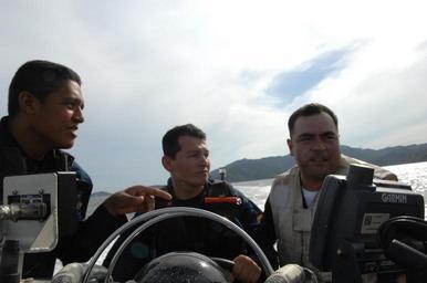 | Keywords: Continuing Promise 2008 080902-N-AT101-064.jpg en U S Navy Boatswain's Mate Chief Daniel Chavez right assigned to the amphibious assault ship USS Kearsarge LHD 3 with two Colombian coast guard members drive a Navy rigid inflatable boat Sept 2 2008 during a training exercise at Santa Marta Coast Guard Base Colombia The information exchange is part of the humanitarian and civic assistance mission Continuing Promise 2008 an equal-partnership mission engaging personnel from the U S Canada Colombia Dominican Republic Trinidad and Tobago and Guyana U S Navy photo by Mass Communication Specialist 3rd Class Maddelin Angebrand/Released 2008-09-02 Petty Officer 2nd Class Maddelin Angebrand https //www dvidshub net/image/1427236 080902-N-AT101-064 2014-06-30 16 00 SANTA MARTA CO PD-USGov-Military-Navy USS Kearsarge LHD-3 Images from DoD uploaded by Fæ |