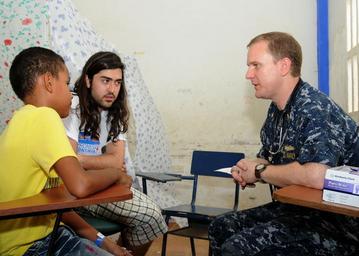 | Keywords: Continuing Promise 2010 action DVIDS310008.jpg en Lt Cmdr Brian Thomas a medical officer embarked aboard the multi-purpose amphibious assault ship USS Iwo Jima speaks with a Colombian boy about his medical history at the Continuing Promise medical site Escuela Ismael Contreas Iwo Jima is operating off the coast of Colombia supporting the Continuing Promise 2010 humanitarian civic assistance mission The assigned medical and engineering staff embarked aboard Iwo Jima are working with partner nation teams to provide medical dental veterinary and engineering assistance to several different nations <br>Unit Navy Media Content Services 2010-08-14 U S Navy photo by Petty Officer 3rd Class Travis J Kuykendall https //www dvidshub net/image/310008/continuing-promise-2010-action 100814-N-+++++-028 2010-08-16 15 24 COVENAS CO PD-USGov-Military-Navy Continuing Promise 2010 Images from US Navy location Iwo Jima Japan Images from DoD uploaded by Fæ |