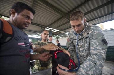 | Keywords: Continuing Promise 2015 150715-N-XQ474-067.jpg en 150715-N-XQ474-067 BUENAVENTURA Colombia - Army Maj Jeremiah Nelson right a native of Martin S D and veterinarian assigned to Post 81st Civil Affairs Battalion Fort Hood Texas examines a dog at a veterinarian site established at Eufermeria Canina del Grupo Antiexplosnos Urbano in support of Continuing Promise 2015 Continuing Promise is a U S Southern Command-sponsored and U S Naval Forces Southern Command/U S 4th Fleet-conducted deployment to conduct civil-military operations including humanitarian-civil assistance subject matter expert exchanges medical dental veterinary and engineering support and disaster response to partner nations and to show U S support and commitment to Central and South America and the Caribbean 2015-07-15 July 15 2015 https //www dvidshub net/image/2072311 150715-N-XQ474-067 2015-07-17 08 08 BUENAVENTURA CO PD-USGov-Military-Navy Fort Hood Texas Images from DoD uploaded by Fæ Continuing Promise 2015 Photographs by Andrew Schneider |