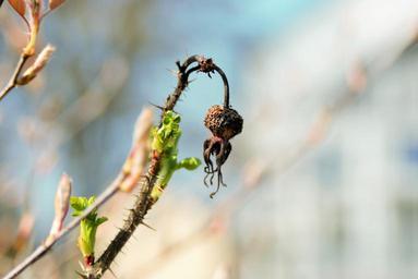 Keywords: contrast death live plant wild rose leaf blue green spring beginning