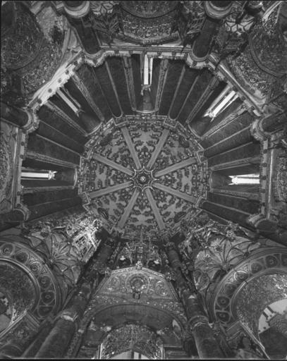 | Keywords: arquitectura gótico portugal convento de cristo conventodecristo tomar fundação calouste gulbenkian fundaçãocaloustegulbenkian mário novais tavares chicó mário tavares chicó máriotavareschicó mário novais márionovais gótica biblioteca de arte bibliotecadearte Abóbada da Charola do Convento. Fotógrafo: Mário Novais, 1899-1967. Orientador científico: Mário Tavares Chicó, 1905-1966 Data aproximada da produção da fotografia original: 1954. [CFT015.362.ic] Convento de Cristo O Convento da Ordem de Cristo e o Castelo Templário, em Tomar, formam um conjunto monumental único no seu género. O Castelo foi fundado em 1160 por Dom Gualdim Pais, Mestre provincial da Ordem do Templo em Portugal, e dentro das suas muralhas viveram as primeiras gentes de Tomar. O coração da fortaleza, a Alcáçova, com a torre de menagem, foi construída a Oriente; o lugar místico, a Igreja octogonal Templária, foi construída a Ocidente. Com o extermínio da Ordem pelas perseguições de Filipe, o Belo, Rei de França, os Templários encontraram, em Portugal, a continuidade da sua sagrada missão de Cavalaria. A Ordem do Templo foi extinta em 1312, mas os seus bens e, em parte, a sua vocação, foram transmitidos, em Portugal, à Ordem de Cristo, criada em 1319. Sob os auspícios de D. Dinis é, então, fundada a "Ordem dos Cavaleiros de Cristo", a qual foi durante quatro anos negociada pelo monarca com a Santa Sé, e veio a integrar pessoas e bens da extinta Ordem do Templo. É com a Ordem de Cristo que a nação portuguesa se abre para a empresa das descobertas marítimas do séc. XV. Tomar é, então, sede da Ordem, e o Infante D. Henrique o seu Mestre. Com a expansão da fé cristã e do reino, também a sede da Ordem de Cristo se dilata. Os séculos e a história de Portugal vão deixando, na arquitectura do Convento, testemunhos do tempo e dos homens que lideraram os destinos de Portugal. Durante o governo do infante D. Henrique foram construídos dois claustros góticos no Convento. Com D. Manuel, a igreja templária é prolongada para Ocidente por uma construção que serviria o Capítulo da Ordem. Profusamente impregnada pela simbólica dos Cavaleiros de Cristo, esta construção aloja na sua fachada ocidental a famosa Janela da Sala do Capítulo, de Diogo de Arruda (cerca de 1510). Mais tarde, D. João III pretende fazer profundas mudanças na Ordem, alterando as suas Regras e transformando os Cavaleiros em monges contemplativos; é a partir deste reinado que se iniciam importantes trabalhos de ampliação do Convento, com vista a consumar a Reforma da Ordem. Esses trabalhos vão continuar através de vários reinados, até ao século XVIII, deixando marcas de diversas tendências artísticas. O Convento de Cristo encerra no seu conjunto arquitectónico testemunhos da arte do Românico, templária, do Gótico e do Manuelino, ao tempo das Descobertas, do Renascimento joanino, do Maneirismo, nas suas várias facetas e, por fim, do Barroco, presente em vária ornamentação arquitectónica. Da estrutura arquitectural do Convento, além das edificações construídas em torno da igreja templária, há a salientar o conjunto de quatro grandes claustros articulados por dois eixos em cruz latina, e também um aqueduto com 6 Km de extensão mandado edificar por Filipe II. Integra os domínios conventuais uma área de floresta e cultivo conhecida por Mata dos Sete Montes, por estar confinada por sete colinas de acentuado relevo. (Fonte: IPPAR - tinyurl.com/4dnm5m) Abóbada da Charola do Convento. Fotógrafo: Mário Novais, 1899-1967. Orientador científico: Mário Tavares Chicó, 1905-1966 Data aproximada da produção da fotografia original: 1954. [CFT015.362.ic] Convento de Cristo O Convento da Ordem de Cristo e o Castelo Templário, em Tomar, formam um conjunto monumental único no seu género. O Castelo foi fundado em 1160 por Dom Gualdim Pais, Mestre provincial da Ordem do Templo em Portugal, e dentro das suas muralhas viveram as primeiras gentes de Tomar. O coração da fortaleza, a Alcáçova, com a torre de menagem, foi construída a Oriente; o lugar místico, a Igreja octogonal Templária, foi construída a Ocidente. Com o extermínio da Ordem pelas perseguições de Filipe, o Belo, Rei de França, os Templários encontraram, em Portugal, a continuidade da sua sagrada missão de Cavalaria. A Ordem do Templo foi extinta em 1312, mas os seus bens e, em parte, a sua vocação, foram transmitidos, em Portugal, à Ordem de Cristo, criada em 1319. Sob os auspícios de D. Dinis é, então, fundada a "Ordem dos Cavaleiros de Cristo", a qual foi durante quatro anos negociada pelo monarca com a Santa Sé, e veio a integrar pessoas e bens da extinta Ordem do Templo. É com a Ordem de Cristo que a nação portuguesa se abre para a empresa das descobertas marítimas do séc. XV. Tomar é, então, sede da Ordem, e o Infante D. Henrique o seu Mestre. Com a expansão da fé cristã e do reino, também a sede da Ordem de Cristo se dilata. Os séculos e a história de Portugal vão deixando, na arquitectura do Convento, testemunhos do tempo e dos homens que lideraram os destinos de Portugal. Durante o governo do infante D. Henrique foram construídos dois claustros góticos no Convento. Com D. Manuel, a igreja templária é prolongada para Ocidente por uma construção que serviria o Capítulo da Ordem. Profusamente impregnada pela simbólica dos Cavaleiros de Cristo, esta construção aloja na sua fachada ocidental a famosa Janela da Sala do Capítulo, de Diogo de Arruda (cerca de 1510). Mais tarde, D. João III pretende fazer profundas mudanças na Ordem, alterando as suas Regras e transformando os Cavaleiros em monges contemplativos; é a partir deste reinado que se iniciam importantes trabalhos de ampliação do Convento, com vista a consumar a Reforma da Ordem. Esses trabalhos vão continuar através de vários reinados, até ao século XVIII, deixando marcas de diversas tendência