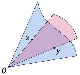 | Keywords: Convex cone illust.svg A convex cone light blue Inside of it the light red convex cone consists of all points αx + βy with α>0 and β>0 for the depicted x and y The curves on the upper right symbolize that the regions are infinite in extent L'insieme azzurro è un cono convesso L'insieme in viola corrisponde al cono convesso generato da x e y Own Oleg Alexandrov Made with Inkscape Convex geometry Optimization Files by User Oleg Alexandrov from en wikipedia | ||||
