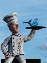 Keywords: cooking kitchen fish preparation presentation eat meal chef's hat man person restaurant serve fish dish