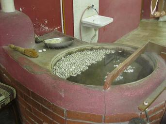 Keywords: Cooking of silk cocoons.jpg Kochen der Seidenraupen in einer Seidenmanufaktur own MyName A1000 <span class signature-talk >talk</span> Spinning silk Cc-zero