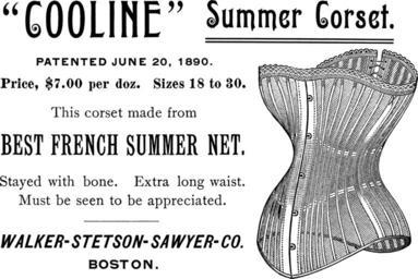 | Keywords: COOLINENovember1894.png COOLINE Summer Corset PATENTED JUNE 20 1890 Price 7 00 per doz Sizes 18 to 30 This corset made from BEST FRENCH SUMMER NET Stayed with bone Extra long waist Must be seen to be appreciated WALKER-STETSON-SAWYER-CO BOSTON NEWS FOR BUYERS BOSTON 1894-11 Anonymus PD Image COOLINENovember1894cut png PD-old Hourglass corset Victorian Corset advertisements 1894 advertisements Fashion in 1894 | ||||