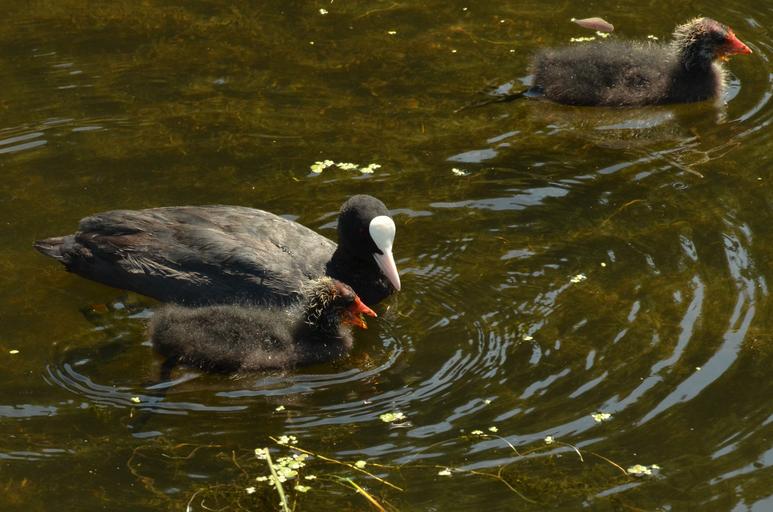 Keywords: coot bird waterfowl young feed parents water nature