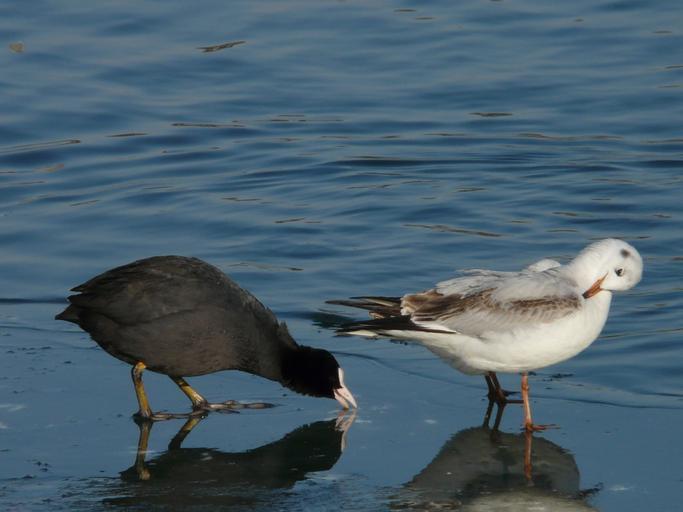 Keywords: coot seagull pair black and white waterfowl togetherness drink clean foraging fulica atra ralle laridae