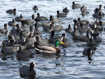 Keywords: coots mallard water anders affiliation group individually surrounded right in the middle bird animal drake water bird swim river