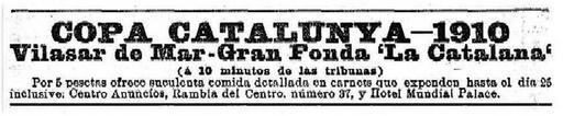 | Keywords: Copa-Catalunya-1910-Mundial-Palace-hotel-comida.jpg es Copa Catalunya “ 1910 - Vilasar de Mar “ Gran Fonda La Catalana La Vanguardia Barcelona 21-5-1910 pag 1 Copa Catalunya 1910-05-21 Copa Catalunya “ 1910 Vilasar de Mar “ Gran Fonda La Catalana à 10 minutos de las tribunas Por 5 pesetas ofrece suculenta comida detallada en carnets que expenden hasta el dia 25 inclusivo Centro Anuncios Rambla del Centro numero 37 y Hotel Mundial Palace PD-old ImageNote 1 11 27 953 153 975 202 2 Copa Catalunya “ 1910 Vilasar de Mar “ Gran Fonda La Catalana à 10 minutos de las tribunas Por 5 pesetas ofrece suculenta comida detallada en carnets que expenden hasta el dia 25 inclusivo Centro Anuncios Rambla del Centro numero 37 y Hotel Mundial Palace ImageNoteEnd 1 Copa Catalunya La Vanguardia advertisements 1910 Mundial Palace Hotel 1910 1910 advertisements in Spain |