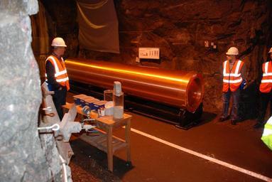 Keywords: Copper canister, bentonite.jpg en A copper canister on display in a storage tunnel; on the table jars with bentonite clay own Pieter Kuiper 2010-06-03 SKB Äspö laboratory 2010 in Oskarshamn Municipality June 2010 in Sweden