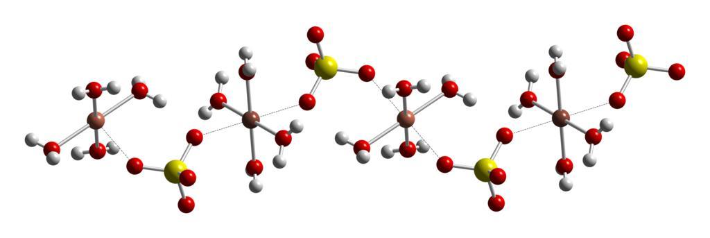 | Keywords: Copper(II)-sulfate-pentahydrate-CuOSOCu-chain-from-xtal-2007-CM-3D-balls.png Ball-and-stick diagram of part of the crystal structure of copper II sulfate pentahydrate CuSO<sub>4</sub>·5H<sub>2</sub>O Colour code Copper Cu orange-pink Sulfur S yellow Oxygen O red Hydrogen H white Crystal structure from http //dx doi org/10 2138/am 2007 2229 American Mineralogist 2007 92 532 “545 Image generated in http //www crystalmaker com/ CrystalMaker 8 3 Own 2010-07-26 Ben Mills Benjah-bmm27 Images by Ben Mills Ball-and-stick models Crystal structures of copper II sulfate pentahydrate |