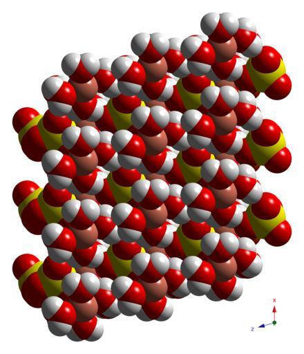 | Keywords: Copper(II)-sulfate-pentahydrate-b-axis-xtal-2007-CM-3D-sf.png Space-filling diagram of part of the crystal structure of copper II sulfate pentahydrate CuSO<sub>4</sub>·5H<sub>2</sub>O Viewed down the b axis of the triclinic unit cell Colour code Copper Cu orange-pink Sulfur S yellow Oxygen O red Hydrogen H white Crystal structure from http //dx doi org/10 2138/am 2007 2229 American Mineralogist 2007 92 532 “545 Image generated in http //www crystalmaker com/ CrystalMaker 8 3 Own 2010-07-26 Ben Mills Benjah-bmm27 Images by Ben Mills Space-filling models Crystal structures of copper II sulfate pentahydrate |