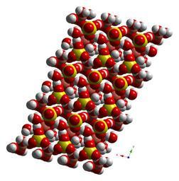 | Keywords: Copper(II)-sulfate-pentahydrate-c-axis-xtal-2007-CM-3D-sf.png Space-filling diagram of part of the crystal structure of copper II sulfate pentahydrate CuSO<sub>4</sub>·5H<sub>2</sub>O Viewed down the c axis of the triclinic unit cell Colour code Copper Cu orange-pink Sulfur S yellow Oxygen O red Hydrogen H white Crystal structure from http //dx doi org/10 2138/am 2007 2229 American Mineralogist 2007 92 532 “545 Image generated in http //www crystalmaker com/ CrystalMaker 8 3 Own 2010-07-26 Ben Mills Benjah-bmm27 Images by Ben Mills Space-filling models Crystal structures of copper II sulfate pentahydrate |