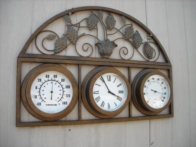 Keywords: copper temperature clock humidity thermometer hygrometer roman numerals grapes patina