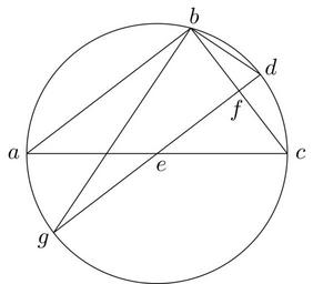 | Keywords: Coppernicus 008.svg de à ber die Kreisbewegungen der Weltkörper 8 File Kreisbewegungen-Coppernicus-0 djvu p 34 1879 w Nicolaus Copernicus File Coppernicus8 png PD-old-100 De revolutionibus drawings LaTeX Source Code <syntaxhighlight lang latex > complile with »pdflatex« \documentclasstikz convert pdf2svg standalone \begin document \begin tikzpicture \draw 0 0 circleradius 2; \pgfmathsetmacro \CEB 75 ; \coordinate A at 180 2 ; \coordinate B at \CEB 2 ; \coordinate C at 0 2 ; \coordinate D at \CEB/2 2 ; \coordinate E at 0 0 ; \coordinate G at \CEB/2-180 2 ; \pathdraw name path lineBC B -- C ; \pathdraw name path lineGD G -- D ; \pathname intersections of lineBC and lineGD name sectionF ; \coordinate F at sectionF-1 ; \draw A -- B ; \draw A -- C ; \draw B -- G ; \draw B -- D ; \draw A + 180 0 2 node a ; \draw B + \CEB 0 2 node b ; \draw C + 0 0 2 node c ; \draw D + \CEB/2 0 2 node d ; \draw E + \CEB/4-90 0 2 node e ; \draw F + \CEB/2-135 0 3 node f ; \draw G + \CEB/2-180 0 2 node g ; \end tikzpicture \end document </syntaxhighlight> |