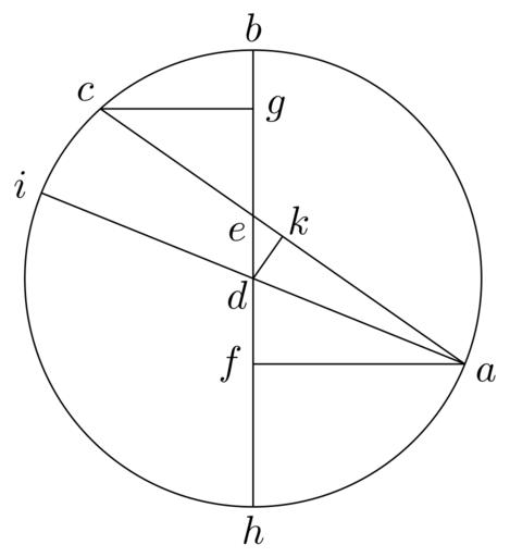 Keywords: Coppernicus 027.svg de à ber die Kreisbewegungen der Weltkörper 27 File Kreisbewegungen-Coppernicus-0 djvu p 55 1879 w Nicolaus Copernicus File Coppernicus_027 png PD-old-100 De revolutionibus drawings LaTeX Source Code <syntaxhighlight lang latex > complile with »pdflatex« \documentclasstikz convert pdf2svg standalone \usetikzlibrary calc intersections \begin document \begin tikzpicture \coordinate A at -22 2 ; \coordinate B at 90 2 ; \coordinate C at 132 2 ; \coordinate D at 0 0 ; \coordinate F at B - A ; \coordinate G at B - C ; \coordinate H at -90 2 ; \coordinate I at 158 2 ; \coordinate K at A 5 C ; \draw D circleradius 2cm; \draw I -- A ; \pathdraw name path lineAC A -- C ; \pathdraw name path lineHB H -- B ; \pathname intersections of lineAC and lineHB name sectionE ; \coordinate E at sectionE-1 ; \draw D -- K ; \draw C -- G ; \draw F -- A ; \draw A + -22 0 2 node a ; \draw B + 90 0 2 node b ; \draw C + 132 0 2 node c ; \draw D + -135 0 2 node d ; \draw E + -135 0 2 node e ; \draw F + 180 0 2 node f ; \draw G + 0 0 2 node g ; \draw H + -90 0 2 node h ; \draw I + 158 0 2 node i ; \draw K + 45 0 2 node k ; \end tikzpicture \end document </syntaxhighlight> |