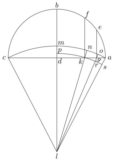 | Keywords: Coppernicus 043.svg de à ber die Kreisbewegungen der Weltkörper 43 File Kreisbewegungen-Coppernicus-0 djvu p 139 1879 w Nicolaus Copernicus File Coppernicus_043 png PD-old-100 De revolutionibus drawings LaTeX Source Code <syntaxhighlight lang latex > complile with »pdflatex« \documentclasstikz convert pdf2svg standalone \usepackage tkz-euclide \usetkzobj all \begin document \begin tikzpicture \tkzSetUpLineline width 0 4pt \pgfmathsetmacro \DA 2 33 ; \pgfmathsetmacro \ADE 35 ; \tkzDefPoint 0 \DA A \tkzDefPoint 90 \DA B \tkzDefPoint 180 \DA C \tkzDefPoint 0 0 D \tkzDefPoint \ADE \DA E \tkzDefPoint 90-\ADE \DA F \tkzDefPoint 0 -1 93 \DA L \coordinate G at E -D ; \coordinate K at F -D ; \begin pgfinterruptboundingbox \tkzInterLC L B L A \tkzGetPoints M2 M \tkzInterLC L K L A \tkzGetPoints N2 N \tkzInterLC L G L A \tkzGetPoints O2 O \tkzInterLC L B L K \tkzGetPoints P2 P \tkzInterLC L G L K \tkzGetPoints R2 R \tkzInterLC L A L K \tkzGetPoints S2 S \end pgfinterruptboundingbox \draw A -- C ; \tkzDrawArccolor black D A C \tkzDrawArccolor black L A C \tkzDrawArccolor black L S P \draw E -- G ; \draw F -- K ; \draw L -- A ; \draw L -- B ; \draw L -- C ; \draw L -- N ; \draw L -- O ; \draw A + 0 0 2 node a ; \draw B + 90 0 2 node b ; \draw C + 180 0 2 node c ; \draw D + -45 0 2 node d ; \draw E + \ADE 0 2 node e ; \draw F + 90-\ADE 0 2 node f ; \draw G + -45 0 15 noderotate -30 \small g ; \draw K + -140 0 25 node k ; \draw L + -90 0 2 node l ; \draw M + 35 0 25 node m ; \draw N + 45 0 2 node n ; \draw O + 45 0 2 node o ; \draw P + 45 0 2 node p ; \draw R + -70 0 2 node r ; \draw S + -45 0 2 node s ; \end tikzpicture \end document </syntaxhighlight> |