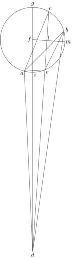 | Keywords: Coppernicus 071.svg de à ber die Kreisbewegungen der Weltkörper 71 File Kreisbewegungen-Coppernicus-0 djvu p 212 1879 w Nicolaus Copernicus File Coppernicus_071 png PD-old-100 De revolutionibus drawings LaTeX Source Code <syntaxhighlight lang latex > complile with »pdflatex« \documentclasstikz convert pdf2svg standalone \usepackage tkz-euclide \usetkzobj all \begin document \begin tikzpicture \tkzSetUpLineline width 0 4pt \pgfmathsetmacro \FG 1 94 ; \tkzDefPoint -105 \FG A \tkzDefPoint 15 \FG B \tkzDefPoint 60 \FG C \tkzDefPoint -90 6 5 \FG D \tkzDefPoint 0 0 F \tkzDefPoint 90 \FG G \tkzDefPoint 90 -\FG I \begin pgfinterruptboundingbox \tkzInterLC C D F C \tkzGetPoints C E \end pgfinterruptboundingbox \coordinate L at C F D ; \tkzInterLC L F F C \tkzGetPoints M M2 \tkzDrawCircle F C \draw C -- D ; \draw C -- A ; \draw B -- D ; \draw A -- D ; \draw A -- E ; \draw B -- A ; \draw G -- D ; \draw B -- E ; \draw M -- F ; \draw A + -135 0 2 node a ; \draw B + 28 0 2 node b ; \draw C + 65 0 2 node c ; \draw D + -90 0 2 node d ; \draw E + -45 0 2 node e ; \draw F + 180 0 2 node f ; \draw G + 90 0 2 node g ; \draw I + -45 0 2 node i ; \draw L + 60 0 2 node l ; \draw M + 0 0 2 node m ; \end tikzpicture \end document </syntaxhighlight> |