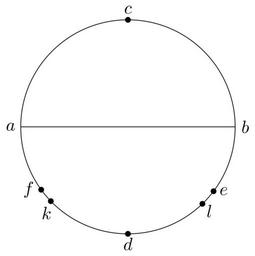 | Keywords: Coppernicus 076.svg de à ber die Kreisbewegungen der Weltkörper 76 File Kreisbewegungen-Coppernicus-0 djvu p 225 1879 w Nicolaus Copernicus File Coppernicus_076 png PD-old-100 De revolutionibus drawings LaTeX Source Code <syntaxhighlight lang latex > complile with »pdflatex« \documentclasstikz convert pdf2svg standalone \begin document \begin tikzpicture \pgfmathsetmacro \EA 2 12 ; \pgfmathsetmacro \dot 0 05 ; \coordinate A at 180 \EA ; \coordinate B at 0 \EA ; \coordinate C at 90 \EA ; \coordinate D at -90 \EA ; \coordinate E at -37 \EA ; \coordinate F at -144 \EA ; \coordinate K at -136 \EA ; \coordinate L at -46 \EA ; \coordinate O at 0 0 ; \draw O circleradius \EA; \drawfill C circleradius \dot; \drawfill D circleradius \dot; \drawfill E circleradius \dot; \drawfill F circleradius \dot; \drawfill K circleradius \dot; \drawfill L circleradius \dot; \draw A -- B ; \draw A + 180 0 2 node a ; \draw B + 0 0 2 node b ; \draw C + 90 0 2 node c ; \draw D + -90 0 2 node d ; \draw E + 0 0 2 node e ; \draw F + 180 0 25 node f ; \draw K + -110 0 25 node k ; \draw L + -46 0 2 node l ; \end tikzpicture \end document </syntaxhighlight> |