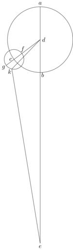 Keywords: Coppernicus 078.svg de à ber die Kreisbewegungen der Weltkörper 78 File Kreisbewegungen-Coppernicus-0 djvu p 230 1879 w Nicolaus Copernicus File Coppernicus_078 png PD-old-100 De revolutionibus drawings LaTeX Source Code <syntaxhighlight lang latex > complile with »pdflatex« \documentclasstikz convert pdf2svg standalone \usepackage tkz-euclide \usetkzobj all \begin document \begin tikzpicture \tkzSetUpLineline width 0 4pt \pgfmathsetmacro \DA 1 9 ; \tkzDefPoint 90 \DA A \tkzDefPoint -90 \DA B \tkzDefPoint -143 \DA C \tkzDefPoint 0 0 D \tkzDefPoint -90 6 2 \DA E \coordinate G at D 1 3 C ; \tkzDefPointByrotation center C angle 40 G \tkzGetPoint K \tkzInterLC D G C G \tkzGetPoints F G \tkzDrawCircle D A \tkzDrawCircle C G \draw A -- E ; \draw D -- K ; \draw D -- G ; \draw E -- K ; \draw A + 90 0 2 node a ; \draw B + -45 0 2 node b ; \draw C + 180 0 2 node c ; \draw D + 0 0 2 node d ; \draw E + -90 0 2 node e ; \draw F + 80 0 25 node f ; \draw G + -140 0 2 node g ; \draw K + -130 0 2 node k ; \end tikzpicture \end document </syntaxhighlight> |