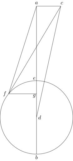 | Keywords: Coppernicus 131.svg de à ber die Kreisbewegungen der Weltkörper 131 File Kreisbewegungen-Coppernicus-0 djvu p 346 1879 w Nicolaus Copernicus File Coppernicus_131 png PD-old-100 De revolutionibus drawings LaTeX Source Code <syntaxhighlight lang latex > complile with »pdflatex« \documentclasstikz convert pdf2svg standalone \usepackage tkz-euclide \usetkzobj all \begin document \begin tikzpicture \tkzSetUpLineline width 0 4pt \pgfmathsetmacro \DA 7 1 ; \pgfmathsetmacro \DE 0 33 \DA ; \tkzDefPoint 0 \DA A \tkzDefPoint 0 22 \DA \DA C \tkzDefPoint 0 0 D \tkzDefPoint 90 \DE E \tkzDefPoint 140 \DE F \coordinate G at F- D ; \begin pgfinterruptboundingbox \tkzInterLC A D D E \tkzGetPoints E B \end pgfinterruptboundingbox \tkzDrawCircle D E \draw A -- B ; \draw A -- C ; \draw A -- F ; \draw C -- D ; \draw C -- F ; \draw F -- G ; \draw A + 90 0 2 node a ; \draw B + -90 0 2 node b ; \draw C + 70 0 2 node c ; \draw D + 0 0 2 node d ; \draw E + 135 0 2 node e ; \draw F + 180 0 25 node f ; \draw G + -135 0 2 node g ; \end tikzpicture \end document </syntaxhighlight> |