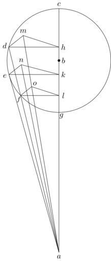 Keywords: Coppernicus 133.svg de à ber die Kreisbewegungen der Weltkörper 133 File Kreisbewegungen-Coppernicus-0 djvu p 350 1879 w Nicolaus Copernicus File Coppernicus_133 png PD-old-100 De revolutionibus drawings LaTeX Source Code <syntaxhighlight lang latex > complile with »pdflatex« \documentclasstikz convert pdf2svg standalone \usepackage tkz-euclide \usetkzobj all \begin document \begin tikzpicture \tkzSetUpLineline width 0 4pt \pgfmathsetmacro \BC 2 35 ; \pgfmathsetmacro \dot 0 05 ; \tkzDefPoint -90 3 7 \BC A \tkzDefPoint 0 0 B \tkzDefPoint 90 \BC C \tkzDefPoint 165 \BC D \tkzDefPoint -90 \BC G \tkzDefPoint 145 0 84 \BC M \tkzTangentfrom A B C \tkzGetPoints E2 E \begin pgfinterruptboundingbox \tkzInterLC A D B C \tkzGetPoints F D \coordinate H at A D C ; \coordinate K at A E C ; \coordinate L at A F C ; \tkzDefLineparallel through E D M \tkzGetPoint N' \coordinate N at E 0 85 N' ; \tkzDefLineparallel through F D M \tkzGetPoint O' \tkzInterLL A M F O' \tkzGetPoint O \end pgfinterruptboundingbox \tkzDrawCircle B C \drawfill B circleradius \dot; \draw A -- C ; \draw A -- D ; \draw A -- E ; \draw A -- M ; \draw A -- N ; \draw D -- H ; \draw D -- M ; \draw E -- K ; \draw E -- N ; \draw F -- L ; \draw F -- O ; \draw H -- M ; \draw K -- N ; \draw L -- O ; \draw A + -90 0 2 node a ; \draw B + 0 0 2 node b ; \draw C + 90 0 2 node c ; \draw D + 160 0 2 node d ; \draw E + -160 0 2 node e ; \draw F + -115 0 2 node \footnotesize f ; \draw G + -55 0 2 node g ; \draw H + 0 0 2 node h ; \draw K + 0 0 2 node k ; \draw L + 0 0 2 node l ; \draw M + 90 0 2 node m ; \draw N + 90 0 2 node n ; \draw O + 45 0 2 node o ; \end tikzpicture \end document </syntaxhighlight> |