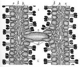 | Keywords: Coprinopsis lagopus Buller.jpg en Original Caption Coprinus lagopus Transverse section through two gills of an unexpanded fruit-body cf Fig 143 highly magnified The hymenium consists of short basidia s; long basidia l; and paraphyses p The subhymenium and trama are but small in amount and not sharply marked off from one another The cystidium c crosses the interlamellar space i i and is attached to the two gills by both its ends These ends strongly adhere to certain enlarged paraphyses or clasping-cells cl Magnification 293 Buller AHR 1924 Researches on Fungi Vol III Longmans Green and Co New York p 323 figure 144 A H Reginald Buller 1924 PD-old Coprinopsis lagopus Fungal morphology and anatomy |