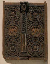 | Keywords: Coptic - Cupboard Doors - Walters 61303.jpg Walters Art Museum artwork Anonymous Coptic <br/> These wooden panels are the finest and most complete examples to survive from the Early Byzantine period having been preserved in the dry sands of Egypt The panels made for a cupboard or cabinet or possibly used as window shutters each have richly carved medallions of interlacing bands set with rosettes or eagles A very similar pair of wooden doors is in Athens Benaki Museum inv 9083 century 5 7 Late Antique wood cm 47 4 34 8 4 8 accession number 61 303 12961 Dikran Kelekian Constantinople and Paris by purchase Charles Kelekian New York 1951 by inheritance Walters Art Museum 1951 by purchase Museum purchase 1951 Beyond the Pharaohs Egypt and the Copts in the Second to Seventh Centuries A D Museum of Art Rhode Island School of Design Providence; The Walters Art Gallery Baltimore 1989 place of origin Egypt Walters Art Museum license Furniture in the Walters Art Museum Ancient Roman art in the Walters Art Museum Coptic art in the Walters Art Museum Media contributed by the Walters Art Museum needs artist review Eagles in art |