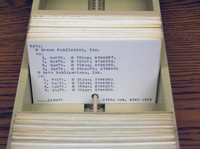 Keywords: Copyright Byte 2.jpg en Copyright catalogs at the Library of Congress Located in room LM-404 of the James Madison Memorial Building Washington DC Own Swtpc6800 Michael Holley 2009-04-30 File Copyright Byte 1 jpg File Copyright Card Catalog Files jpg File Copyright Card Catalog Drawer jpg Copyright Office Card catalogs Photographs by User Swtpc6800 |