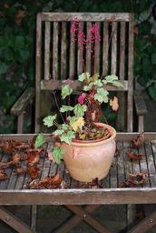 Keywords: coral bells autumn mood still life garden chair leaf coloring pot plant flowers park fall leaves