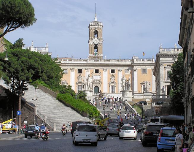 Keywords: Cordonata.at.piazza.campidoglio.rome.arp.jpg en The cordonata a shallow step-less ramp designed by Michaelangelo leading from Via del Teatro Marcello up to Piazza del Campidoglio Rome Italy The two Roman statues at the top of the steps are the mythical twins Castor and Pollux placed there in 1583 The Piazza was designed in the 1530s by Michaelangelo for Pope Paul III The building opposite the top of the steps with the tower is Palazza Senatorio Rome's City Hall The massive flight of 134 steps on the left leads up to the church of Santa Maria in Aracoeli Own Arpingstone unknown Arpingstone Piazza del Campidoglio Rome Cordonata Palazzo dei Senatori Rome