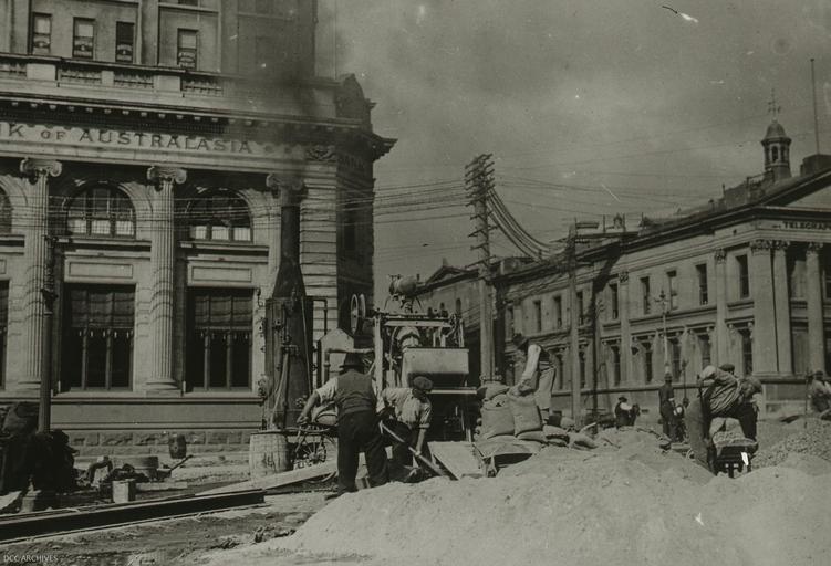 | Keywords: dunedin construction road historic queens gardens queensgardens rattray street rattraystreet blackandwhite monochrome outdoor black and white DCC Archives, Photo 330/39, Street Works - Lantern Slide Collection DCC Archives, Photo 330/39, Street Works - Lantern Slide Collection |