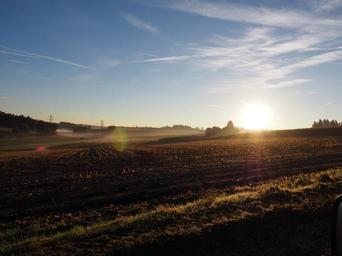 Keywords: cornfield sunrise morning mist fog back light sun sunset nature mood autumn silent landscape sunny blue sunlight morgenstimmung sky foggy morning forest meadow corn