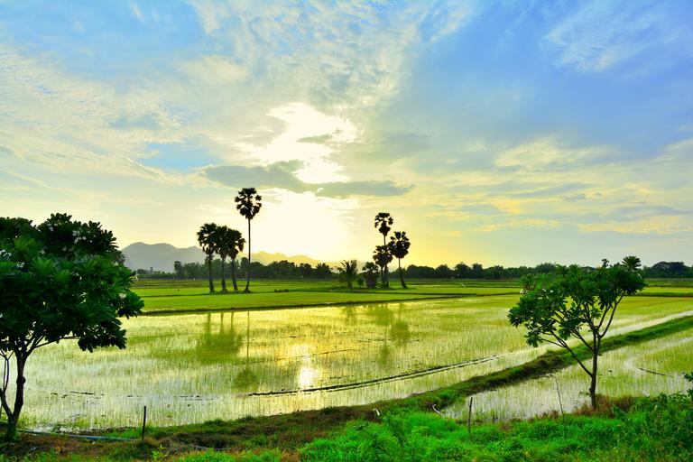 Keywords: cornfield sunset sugar palm silhouettes evening sun rise green view sun rice
