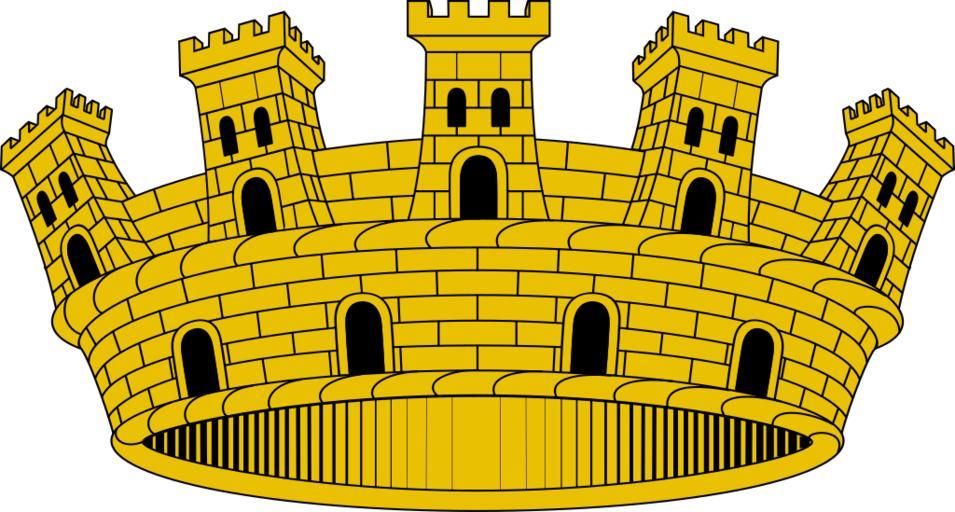 | Keywords: Corona mural - villa.svg Corona mural de Villa Lienzo de muralla con ocho puertas cuatro visibles realzado de ocho torres almenadas cinco visibles unidas hasta la mitad de su altura por un muro sin almenas http //www scgenealogia org/heraldica/heraldcivic htm Introducción general de heráldica cívica Own 2007-12-10 HansenBCN 40px SVG coat of arms elements - mural crowns |
