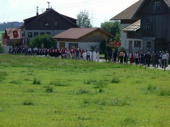 Keywords: corpus christi procession carrying sky flags costume music band maria rain allgäu