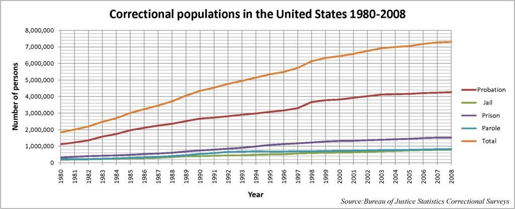 | Keywords: Correctional Populations in the United States 1980-2008.png  A graph that shows the Correctional populations in the United States from 1980 to 2008 It shows probation jail prison and parole correlations <br /> The data table is below 2010-01-05 I Smallman12q talk created this graph using the data found at http //bjs ojp usdoj gov/content/glance/tables/corr2tab cfm The data is released under the Bureau of Justice Statistics from the Bureau of Justice Statistics Correctional Surveys by Lauren Glaze Todd Minton and Heather West on 12/08/09 Transferred from http //en wikipedia org en wikipedia by SreeBot Smallman12q at en wikipedia other versions w File Correctional Populations in the United States 1980-2008 pdf-pdf version for scaling center style background f0f0f0; Year center style background f0f0f0; Probation center style background f0f0f0; Jail center style background f0f0f0; Prison center style background f0f0f0; Parole center style background f0f0f0; Total - 1980 1118097 183988 319598 220438 1842100 - 1981 1225934 196785 360029 225539 2008300 - 1982 1357264 209582 402914 224604 2194400 - 1983 1582947 223551 423898 246440 2476800 - 1984 1740948 234500 448264 266992 2690700 - 1985 1968712 256615 487593 300203 3013100 - 1986 2114621 274444 526436 325638 3241100 - 1987 2247158 295873 562814 355505 3461400 - 1988 2356483 343569 607766 407977 3715800 - 1989 2522125 395553 683367 456803 4057800 - 1990 2670234 405320 743382 531407 4350300 - 1991 2728472 426479 792535 590442 4537900 - 1992 2811611 444584 850566 658601 4765400 - 1993 2903061 459804 909381 676100 4948300 - 1994 2981022 486474 990147 690371 5148000 - 1995 3077861 507044 1078542 679421 5342900 - 1996 3164996 518492 1127528 679733 5490700 - 1997 3296513 567079 1176564 694787 5734900 - 1998 3670441 592462 1224469 696385 6134200 - 1999 3779922 605943 1287172 714457 6340800 - 2000 3826209 621149 1316333 723898 6445100 - 2001 3931731 631240 1330007 732333 6581700 - 2002 4024067 665475 1367547 750934 6758800 - 2003 4120012 691301 1390279 769925 6924500 - 2004 4143792 713990 1421345 771852 6995000 - 2005 4166757 747529 1448344 780616 7051900 - 2006 4215361 765819 1492973 799875 7182100 - 2007 4234471 780174 1517867 821177 7274300 - 2008 4270917 785556 1518559 828169 7308200 - Smallman12q Original upload log page en wikipedia Correctional_Populations_in_the_United_States_1980-2008 png Upload date User Bytes Dimensions Comment 2010-01-05 01 18 UTC Smallman12q 17220 bytes 1922×778 <small><nowiki> A graph that shows the Correctional populations in the United States from 1980 to 2008 It shows probation jail prison and parole correlations I ~~~ created this graph using the data found at http</nowiki></small> Crime in the United States Correctional population statistics for the United States Police of the United States Criminal law |