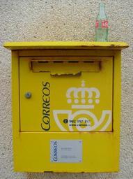 Keywords: Correos4.jpg en yellow square Spanish mailbox Own Sarang 2009-01-31 Post boxes in Spain Yellow mailboxes Correos Coca-Cola bottles